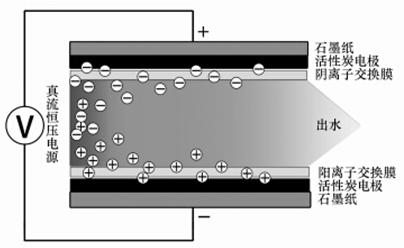 MCDI利用離子交換膜選擇性透過陰、陽離子的特點,既保證離子的正常遷移、吸附過程,又能有效阻止被吸附離子因水流擾動而被帶走,且可避免再生過程中脫附離子被二次吸附于對側電極,從而大大提高了離子去除效率和電極再生效率,其原理如圖 1所示.