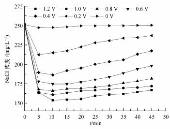 控制水溫25 ℃,進水NaCl濃度250 mg · L-1(氯離子濃度151.6 mg · L-1),流量5.0 mL · min-1,電壓分別為0、0.2、0.4、0.6、0.8、1.0、1.2 V(水的理論分解電壓為1.23 V)時,測出水Cl-濃度、電流、電極兩端電壓.實驗結果如圖 3、4所示.