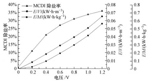 圖 4所示是不同電壓下,MCDI的除鹽率、處理單位水量的能耗(E/V)及去除單位質量NaCl的能耗(E/M).可以看出,隨著電壓增大,MCDI的除鹽率逐漸增大,在1.2 V條件下除鹽率可達35.9%,而相同實驗條件下CDI除鹽率為27.9%,提高了8.0%(相對提高了28.7%).原因可能是CDI加電后,陽離子遷移至負極表面,而物理吸附平衡時在負極表面聚集的陰離子則逆向遷出,正極反之,從而降低了電流效率和離子去除率;而MCDI由于有離子交換膜,一方面可保證離子的正常遷移,另一方面在離子交換膜的選擇透過性作用下,正極在物理吸附平衡時僅吸附了陰離子和少量的陽離子,加電吸附時這少量的陽離子脫附后也幾乎不能穿過陰離子交換膜,負極反之,避免了加電吸附時部分離子的脫附帶來的影響,因此離子去除率和電流效率都能明顯高于CDI.