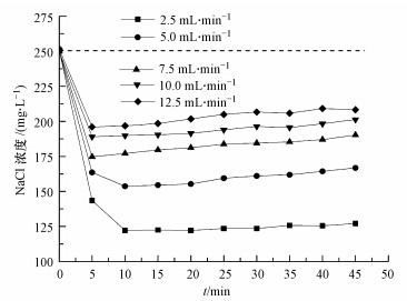 如圖 5所示,流量越小,出水NaCl濃度最低值越小.原因是流量越小,水力停留時間就越長,離子遷移至電極表面的時間越充分,因此出水最低濃度越小.