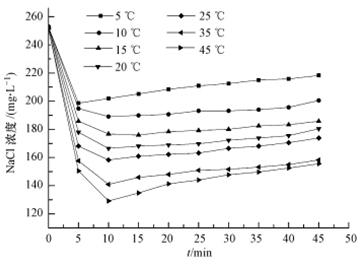 根據圖 7,除了5 ℃,在10~45 ℃條件下,出水NaCl濃度在10 min達最低值,其中在45 ℃條件下,出水濃度達最低點后上升速度較快,這說明較高溫度條件下,雖然離子向電極的遷移速率也有提高,但溶液中離子的熱運動也較為顯著,被吸附的離子容易脫附,因此出水濃度上升速度較快.
