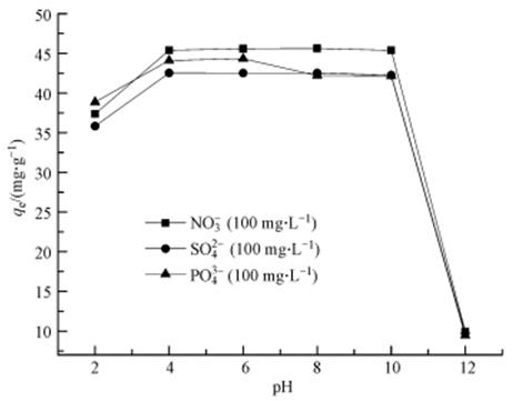 當3 < pH < 10時,3種共存離子的ClO4-的競爭影響趨于穩定狀態,并且此時競爭離子對ClO4-的影響順序為SO42->PO43->NO3-,在此pH范圍內,溶液中PO43-主要以H2PO4-,HPO42-的形式存在,其影響效果小于SO42-,大于NO3-.