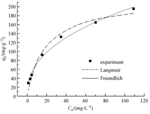 式中,qmax(mg · g-1)為Langmuir吸附等溫線的飽和吸附量;b為Langmuir常數.公式(3)中,Kf和n均為Freundlich常數.