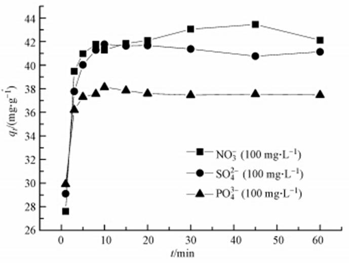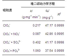 4)3種陰離子競爭吸附下,改性橘子皮吸附ClO4-的行為,符合準二級動力學方程,且由速率常數可得,3種陰離子分別共存下,對ClO4-吸附速率的影響順序為PO43->SO42->NO3-,這是由于ClO4-與共存離子發生再次交換造成的.在實際多種離子共存情況下,應優先把影響因素最大的共存離子去除,再進行ClO4-的吸附,以節約吸附材料的使用量.