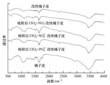 5)對3種陰離子競爭吸附后改性橘子皮的紅外光譜比較分析,證明了NO3-、SO42-、PO43-均在改性橘子皮吸附ClO4-的過程中發生了競爭吸附.