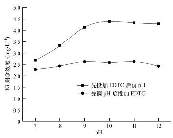 已知EDTC在酸性介質(zhì)中易發(fā)生分解失效(朱玉霜等,1996),因此,利用EDTC脫除廢水中絡(luò)合Ni必須在弱堿性或堿性環(huán)境中進(jìn)行,查閱文獻(xiàn)發(fā)現(xiàn),EDTC最佳pH范圍在6~10之間;同時(shí),考慮到過堿會(huì)造成經(jīng)濟(jì)成本高,故本研究的pH范圍設(shè)定為7~12.本文中EDTC加藥方式有兩種:一種是先調(diào)節(jié)pH值后投加EDTC,另一種是先加EDTC后調(diào)節(jié)pH值.