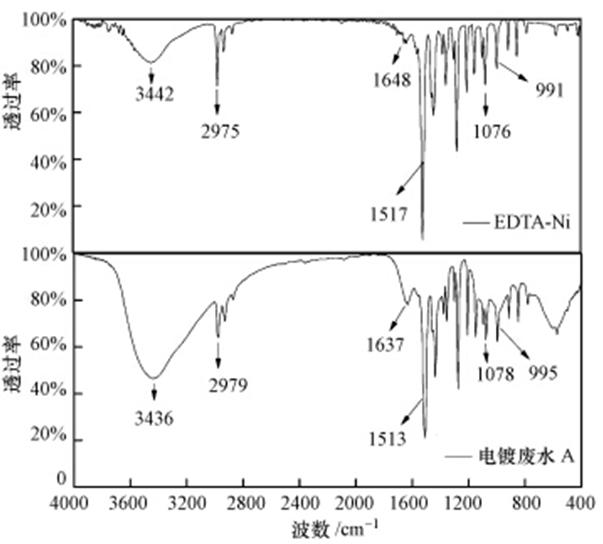 圖 6 EDTA-Ni模擬廢水和電鍍廢水A經(jīng)EDTC沉淀后沉淀產(chǎn)物紅外光譜圖