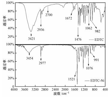 分別對(duì)EDTC、模擬廢水沉淀產(chǎn)物EDTC-Ni進(jìn)行紅外光譜表征,兩者紅外光譜圖如圖 7所示:EDTC在3421 cm-1處有最強(qiáng)吸收峰,此峰為N—H的伸縮振動(dòng);2936 cm-1為C—H伸縮振動(dòng),且低于3000 cm-1,該峰為C—H的飽和吸收峰;2700 cm-1處為—SH很弱的特征吸收峰;1672 cm-1為—SH的伸縮振動(dòng)吸收峰;1063 cm-1為C S伸縮振動(dòng)吸收峰;1496 cm-1為N—CS2的伸縮振動(dòng)吸收峰,此峰介于C—N單鍵(1300 cm-1)和C N雙鍵(1600 cm-1)之間,具有很大的雙鍵性質(zhì);1476 cm-1處為C—S特征吸收峰,982 cm-1為C—S伸縮振動(dòng)吸收峰,表明EDTC是雙齒配位體,即S C—S.