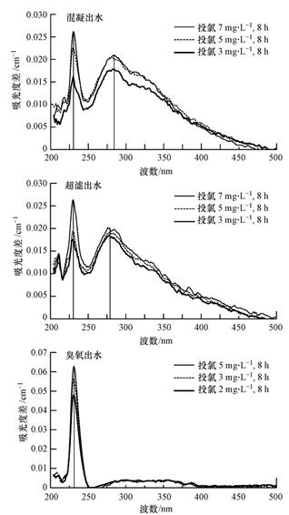紫外-可見(jiàn)吸收差光譜可以用于鑒定共軛生色團(tuán),以此推斷未知物的骨結(jié)構(gòu)架.本文考察了不同氯投加量下,3種再生水水樣的紫外-可見(jiàn)吸收差光譜,結(jié)果如圖 2所示.從圖 2可以看出,加氯前后再生水的紫外-可見(jiàn)光光譜出現(xiàn)了特異性變化,且氯投加量越高,變化越明顯.混凝出水和超濾出水的吸收差光譜在波長(zhǎng)230 nm和280 nm附近出現(xiàn)兩個(gè)峰,臭氧出水僅在波長(zhǎng)230 nm附近出現(xiàn)一個(gè)明顯的峰.根據(jù)電子能級(jí)躍遷理論,230 nm和280 nm處的峰分別表明加氯后水樣中π→π*和n→π*躍遷的減弱.這兩類躍遷均要求有機(jī)化合物分子中含有不飽和基團(tuán),包括共軛多烯、芳香環(huán)、CO和NO2等(劉密新等,2008).解析紫外-可見(jiàn)吸收差光譜可知,加氯可能導(dǎo)致了再生水中一部分不飽和鍵和生色團(tuán)被破壞.