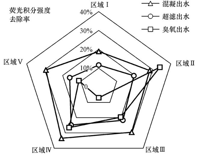 對(duì)各區(qū)域熒光強(qiáng)度積分的降低率進(jìn)行計(jì)算,結(jié)果如圖 5所示.與混凝出水和超濾出水不同,臭氧出水加氯后,各區(qū)域熒光強(qiáng)度的降低具有選擇性,這可能與臭氧先與一部分有機(jī)物發(fā)生了反應(yīng)有關(guān).其中,II區(qū)和IV區(qū)熒光強(qiáng)度降低率較高,這可能與臭氧先將水中大分子物質(zhì)轉(zhuǎn)化成具有II區(qū)和IV區(qū)熒光響應(yīng)的小分子有關(guān),而這部分小分子物質(zhì)可能具有一定氯反應(yīng)活性.混凝出水加氯后各區(qū)域熒光強(qiáng)度的降低率均高于超濾出水,這表明混凝出水中可能含有更高比例的氯反應(yīng)活性物質(zhì).考察III區(qū)和V區(qū)的熒光強(qiáng)度降低程度可以發(fā)現(xiàn),混凝出水>超濾出水>臭氧出水,與再生水水樣余氯衰減速率的快慢一致.III區(qū)和V區(qū)表征腐殖質(zhì)類物質(zhì),表明該類物質(zhì)可能是導(dǎo)致余氯衰減的關(guān)鍵組分.