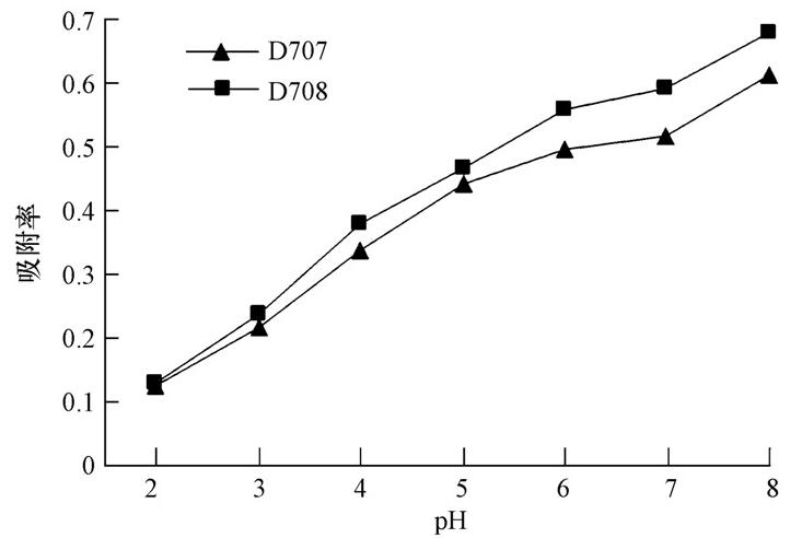 由圖 1可知,D707和D708樹脂對氨氮的吸附量均隨pH值的升高而升高,且D708樹脂的變化幅度較D707樹脂大.廢水中的離子交換反應可用下式表示: