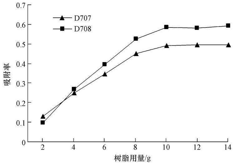 用精密天平準確稱取7個質量梯度的樹脂加入到盛有100 mL氨氮溶液的錐形瓶內,調節溶液的pH值為7,于298 K恒溫振蕩箱中振蕩3 h后用原子吸收儀測定吸附濃度,并計算吸附率(圖 2).由圖 2可以看出,D708樹