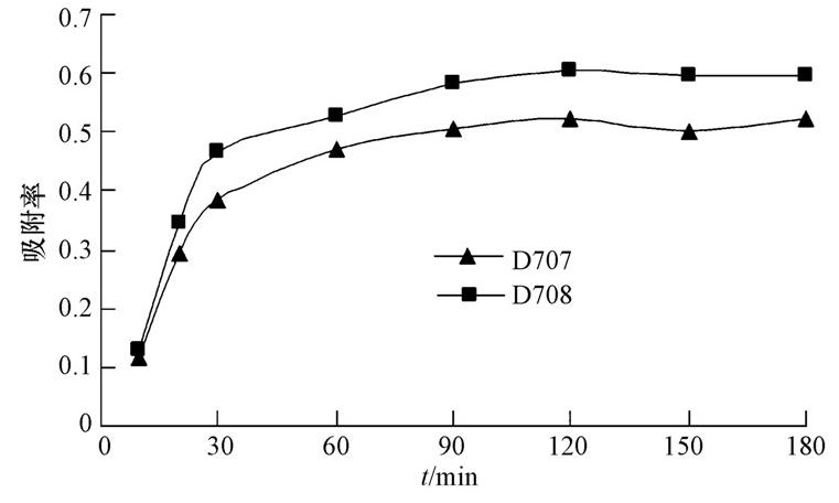 從表 1可以看出,不同預處理方法對樹脂的吸附率有一定影響.經OH-預處理的樹脂的吸附效果好于超純水和H+預處理,這是因為在低H+濃度下NH+4較易被陽離子交換樹脂捕獲.經OH-預處理后部分OH-吸附在樹脂表面,當樹脂進入溶液中,OH-與液相中的H+部分中和,相對提升了整體溶液的pH值,對溶液酸度進行實時檢測后發現,經過OH-預處理后的樹脂使溶液pH值平均提升0.5~1.0,從而間接使NH+4與樹脂磺酸基(—SO3H)結合能力加強.從表 1還可以看出,經OH-預處理后的D708樹脂對NH+4的吸附效果好于D707樹脂,平衡吸附量達到203.8 mg · g-1,D707樹脂平衡吸附量為179.8 mg · g-1.后續實驗均選用經OH-預處理的方法對D707、D708樹脂進行研究.