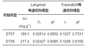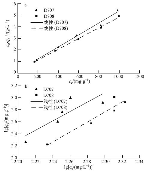 以lgqe對lgce作圖(圖 6b),可以發現,D707樹脂的吸附效果用Freundlich吸附等溫方程的擬合程度較差,R2僅為0.7331,而D708樹脂的吸附效果用Freundlich吸附等溫方程擬合的R2為0.9158.兩種等溫吸附模型擬合參數如表 4所示.