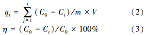 選取一定數量潔凈的250 mL錐形瓶并加入100 mL氨氮廢水,用精密天平準確稱取定量預處理后的樹脂后加入各錐形瓶內,將各錐形瓶放置于恒溫水浴振蕩箱中以恒定轉速振蕩,一定間隔取出樣品并移取溶液至50 mL容量瓶內定容,用可見分光光度計測量剩余濃度Ct,直至吸附平衡,計算吸附量qt和吸附率η: