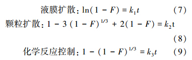 式中,F=qt/qe,qt為反應時間為t時的吸附量(mg · g-1),Qe為平衡時的吸附量(mg · g-1),k1、k2、k3分別為該溫度下的3種擴散系數.分別以ln(1-F)、1-3(1-F)1/3+2(1-F)、1-(1-F)1/3對t作圖,做出3條擬合直線,若直線的可決系數(R2)高,表明在該條件下吸附動力學行為符合該擴散模式,直線的斜率即為反應表觀吸附速率常數,R2最大的一組為吸附過程的主控步驟.以圖 3的數據按上述3個方程進行擬合,結果如表 2所示.從表 2可以看出,D707、D708樹脂經液膜擴散方程擬合的結果可決系數較高,R2分別達到0.9935和0.9963,說明D707、D708樹脂對NH+4的吸附過程均為液膜擴散主控制.