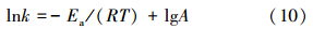 用精密天平準確稱取經OH-預處理后的樹脂10.0 g于100 mL配制氨氮溶液的錐形瓶中,控制恒溫振蕩箱恒定轉速振蕩3 h并調節溶液pH值為7,分別取樣分析,樹脂的氨氮吸附率如圖 4所示.由圖 4可知,兩種樹脂對NH+4的吸附過程均為吸熱過程.隨著溫度升高樹脂對NH+4的吸附率逐漸增大,表明升高溫度對D707、D708樹脂的吸附具有正影響;同時,吸附溫度也會影響吸附熱的大小,吸附需要活化能,隨著溫度的升高,樹脂吸附和解吸氨氮離子的速率加快.以ln(1-F)對t作圖,分別計算得到不同溫度的反應速率常數k,結果如表 3所示.由表 3可知,隨著溫度的升高,樹脂的反應速率常數逐漸增大.根據Arrhenius公式: