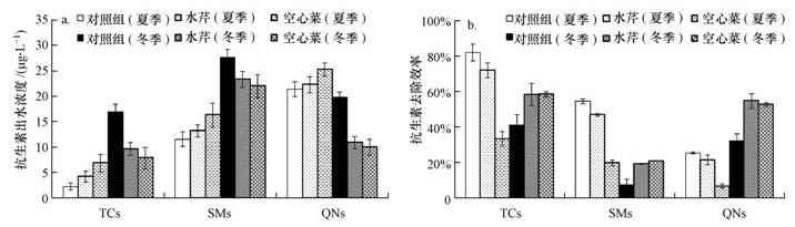 在抗生素出水濃度方面,相比空白對照組,夏季運行下3大類抗生素在空心菜和水芹系統(tǒng)中出水濃度較高,而在冬季則表現(xiàn)出相反的運行情況,種植植物系統(tǒng)中的抗生素在夏季和冬季的出水濃度分別約為4.19~25.24 μg · L-1和7.83~23.28 μg · L-1;在夏季水芹系統(tǒng)抗生素出水濃度(TCs 4.19 μg · L-1、SMs 13.18 μg · L-1、QNs 22.26 μg · L-1)要低于空心菜系統(tǒng)(TCs 6.87 μg · L-1、SMs 16.29 μg · L-1、QNs 25.24 μg · L-1),而在冬季水芹系統(tǒng)抗生素出水濃度要高于空心菜系統(tǒng).在基于水力平衡的抗生素去除效率方面,研究結(jié)果指出,不同季節(jié)情況下抗生素去除效率與抗生素出水濃度結(jié)果相似,即相比空白對照組,水生植物種植系統(tǒng)中抗生素去除效率在夏季較低,而在冬季則表現(xiàn)出較高的去除能力,種植植物系統(tǒng)中3大類抗生素在夏季和冬季的去除效率分別約為6.84%~71.83%和19.25%~58.38%;通過比較不同植物種植系統(tǒng)中抗生素去除效率發(fā)現(xiàn),在夏季水芹系統(tǒng)對抗生素的去除效率分別為71.83%(TCs)、46.80%(SMs)和21.53%(QNs),這要明顯高于空心菜系統(tǒng)(TCs 33.28%、SMs 19.73%、QNs 6.84%),但在冬季運行情況下兩組水生植物濾床對抗生素的去除效率差異不顯著.