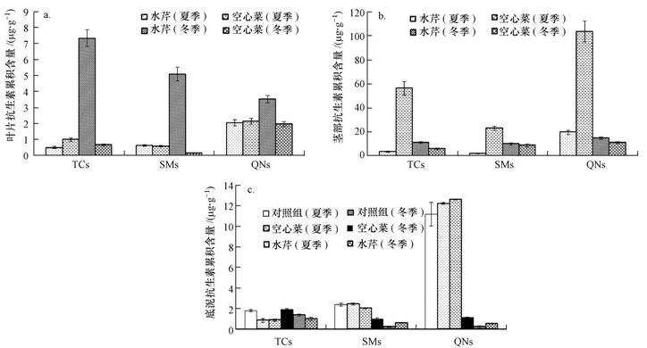 在夏季和冬季試驗?zāi)┢,水生植物濾床中底泥和植物莖葉中抗生素累積含量被分析測定,結(jié)果如圖 2所示.研究表明,植物葉片和莖部中抗生素累積含量分別約為0.15~7.33 μg · g-1(以干重計,下同)和1.72~103.7 μg · g-1,相比植物葉片,3類抗生素在植物莖部都具有較高的累積含量.但在夏季運行情況下,3類抗生素在空心菜莖部具有明顯較高的累積含量(22.89~103.7 μg · g-1),而在冬季3類抗生素在水芹葉片中具有明顯較高的累積含量(3.52~7.33 μg · g-1).通過含量集合可知在夏季空心菜中抗生素累積含量較高,而水芹則在冬季要比空心菜累積更多的抗生素成分.然而在底泥方面,四環(huán)素類和磺胺類抗生素的累積含量相似,并且受季節(jié)因素影響并不顯著;但對于喹諾酮類抗生素,研究發(fā)現(xiàn)其在夏季系統(tǒng)底泥中累積含量約為11.17~12.26 μg · g-1,這要明顯高于其在冬季系統(tǒng)中累積含量.