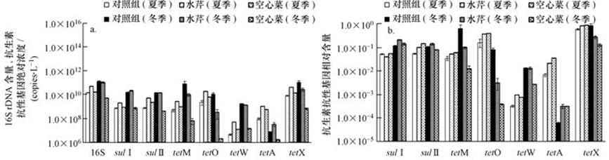 在夏季和冬季試驗?zāi)┢,為了考察分析深度處理養(yǎng)殖廢水過程中微生物在水生植物濾床中的變化趨勢,3組系統(tǒng)的出水及底泥中抗生素抗性基因含量和16S rDNA水平被測定,并且為減少分析測定過程中所產(chǎn)生的誤差,本研究后續(xù)論述將基于抗生素抗性基因的相對含量(目標基因拷貝數(shù)/16S rDNA拷貝數(shù))進行分析探討.
