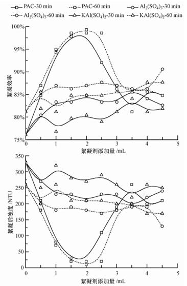 式中,η為絮凝效率;TUt為絮凝劑加入后t時(shí)刻的液相濁度(NTU);TU0為絮凝劑初始加入時(shí)刻的液相濁度(NTU).