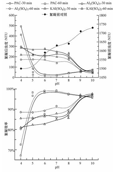由圖 2a可以看出,絮凝前,含酵母細(xì)胞液相的濁度隨著pH的增加而升高;在pH 4~10范圍內(nèi),對(duì)應(yīng)溶液濁度為1500—1730 NTU.當(dāng)絮凝進(jìn)行30 min和60 min時(shí),Al2(SO4)3和KAl(SO4)2組的絮凝效果均在液相pH在8以上開(kāi)始出現(xiàn)明顯變化.例如,pH為8時(shí),Al2(SO4)3和KAl(SO4)2組在30 min時(shí)對(duì)應(yīng)上清液濁度分別為235 NTU和219 NTU;而pH為9時(shí),對(duì)應(yīng)濁度分別降低到了65.3 NTU和67.2 NTU.PAC在pH在6~7范圍內(nèi)的絮凝效果較好,30 min和60 min時(shí)對(duì)應(yīng)上清液濁度分別在22.2~27.94 NTU和13.2~14.4 NTU.