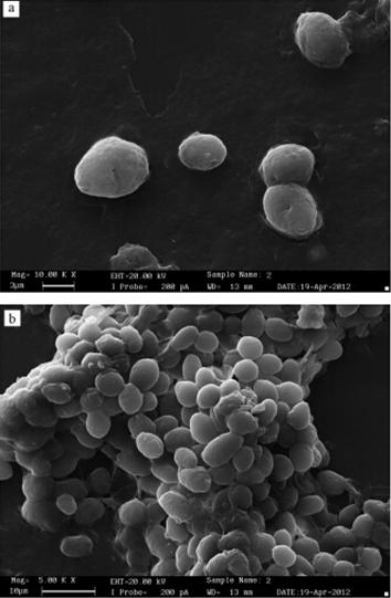圖 4 PAC絮凝前后酵母細(xì)胞SEM分析(a. 絮凝前(×10000); b. 絮凝1 min后(×5000))