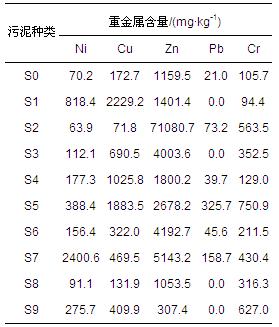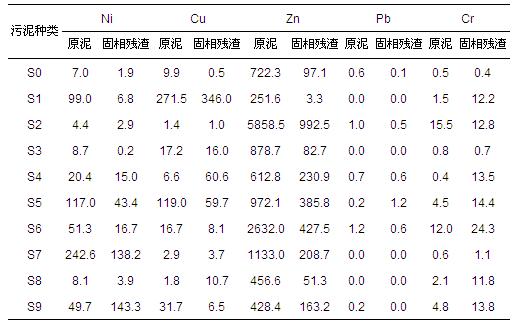 試驗中用的污泥是10種來自江蘇省不同污水廠的脫水污泥(編號為S0~S9),污泥從脫水機房采集后放置在保鮮盒內帶回實驗室,置于冰箱內保存(0~4 ℃)至試驗使用.采用部分污泥經干燥、碾磨過100目篩處理后進行有機質、pH等性質的測定,脫水污泥性質及重金屬含量見表 1.試驗中主要測定7種常見且毒性較強的重金屬(Ni、Cu、Zn、Pb、Cr、Cd、As)含量,其中,Cd、As出現在多數污泥與固相殘渣中未檢出的結果,且數據波動較大.由于這兩種重金屬檢測數據存在一定問題,本文評估中不將其作為對象考慮.本次實驗中選取的10種污泥重金屬含量范圍對于江蘇省城市污泥具有一定的代表性(鄭翔翔等,2007).