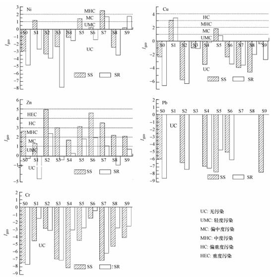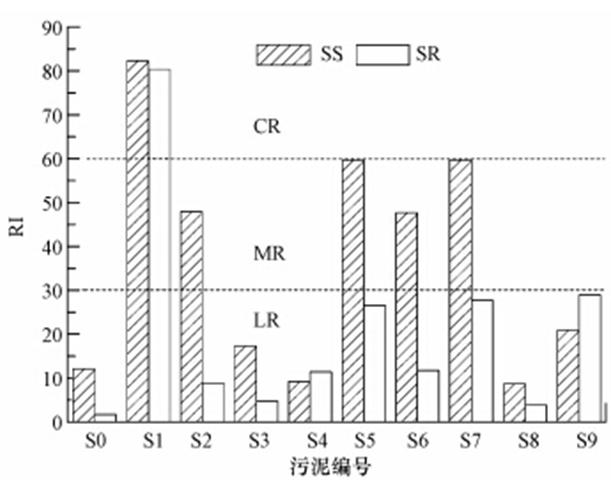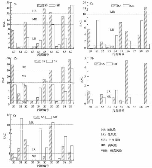 在評價重金屬風險過程中,評價重金屬生物利用度和生態毒性的方法——地層累積指數(Igeo)、潛在生態風險指數(RI)、風險評估指數(RAC),不僅適用于土壤、沉積物、道路砂石的評價(Liu et al., 2008;Shi et al., 2010;劉波,2010),也適用于污泥尤其是在采用污泥改良或修復土壤過程中的評價.基于此,本文從重金屬的含量、化學形態分布及浸出毒性等多方面出發,采用以上評價方法對10種源自不同污水廠的污泥超臨界水氣化處理前后固相產物中重金屬的環境生態風險進行綜合評價,探討超臨界水氣化處理前后污泥中重金屬的生態風險及對環境污染程度的變化,以期為超臨界水氣化技術處理污泥提供一定的理論依據.