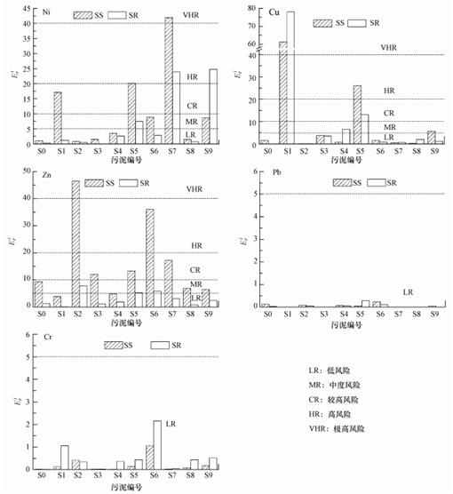 根據不同種污泥原泥與固相殘渣中單一重金屬潛在生態風險評價指數值(圖 3),污泥中重金屬潛在生態風險性順序為Ni/Cu/Zn>Cr>Pb.原泥與固相殘渣中Pb、Cr的污染指數值(Eir)均小于5,屬于低生態風險.污泥中Ni的Eir值在各個區間均有分布,大部分污泥中Ni被認為屬于低中等風險或較高風險范圍.絕大部分污泥中Cu屬于低生態風險,部分污泥(S1、S5)中Cu屬于高風險或極高風險.固相殘渣中單項重金屬的Eir值低于原泥,潛在生態風險等級降低.以Zn為例,原泥中Zn的Eir值在5~40范圍內,屬于中等風險或高風險,固相殘渣中Eir值均低于10,屬于低風險或中等風險.S9污泥超臨界水氣化后固相殘渣中Ni、Cr的單項潛在生態風險指數高于原泥,這可能是由于在反應過程中反應釜發生腐蝕,釋放出不穩定態的Ni、Cr(Marrone et al., 2009).超臨界水氣化處理污泥過程中反應釜腐蝕的現象應該引起一定關注.S1、S4污泥超臨界水氣化后固相殘渣中Cu的單項潛在生態風險指數高于原泥,其中,S4可能由于原泥pH處于堿性范圍,堿性條件有利于重金屬穩定到固相殘渣中(Jin et al., 2010).