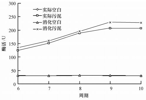 從第6周期開始,每周期開始檢測并計算系統(tǒng)中木聚糖酶活性狀況,結果如圖 5所示.與圖 3繪制數據處理相同,實際污泥與消化污泥酶活性曲線均以3組平行實驗數據求平均值繪制而成,與圖 3對應一致.