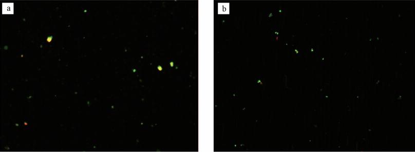 圖 8 LIVE/DEAD顯微圖像(a. 實際污泥;b.消化污泥; 圖中綠色為活菌;紅色為死菌;黃色為兩種熒光顏色疊加效果)
