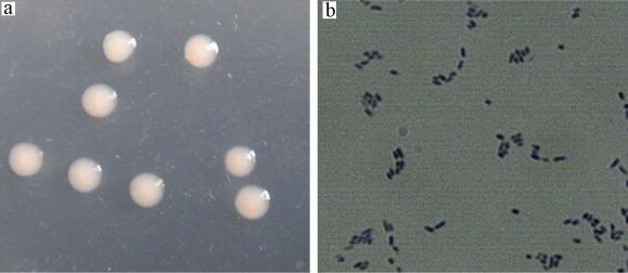 菌株DW1在LB培養基上的菌落及菌體形態見圖 1.菌株DW1菌落呈淺粉紅色,圓形、濕潤,邊緣整齊.