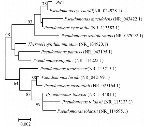 通過對菌株DW1進行16S rDNA擴增、克隆測序后得到大小為1498 bp的序列,系統發育樹結果顯示(見圖 2)DW1與Pseudomonas gessardii (NR_024928.1)聚于同一個分支上,序列相似性達99%,結合形態觀察和生理生化特性(表 2),DW1初步鑒定為Pseudomonas sp..