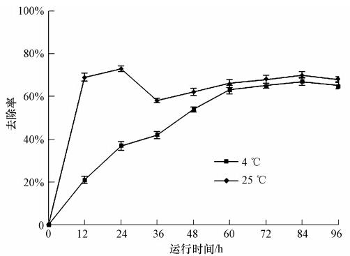 低溫條件下,菌株DW1對污水中COD的去除率隨著運行時間的延長增加(圖 3),運行60 h后,COD的去除率趨于穩定,達到67%;常溫條件下,菌株DW1對污水中COD的去除率先迅速升高,運行24 h去除率達到最大值73%,后出現小幅下降,最后趨于穩定.通過菌株DW1在低溫和常溫對污水中COD去除率的比較,運行36 h內,菌株DW1在常溫對污水中COD的去除率明顯高于低溫;36 h后兩者趨于穩定,且在常溫對污水中COD的去除率略高于低溫.