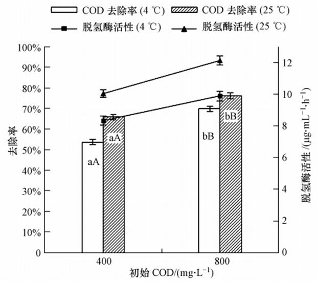 7%的接種量將耐冷菌接種到初始COD分別為400 mg · L-1、800 mg · L-1的模擬生活污水中,分別于4 ℃、25 ℃搖床培養96 h,計算其在低溫、常溫下COD的去除率及DHA活性.