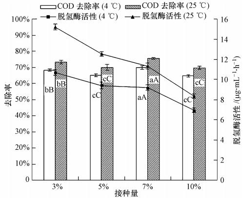 分別以3%、5%、7%、10%的比例投加耐冷菌,分別于4 ℃、25 ℃搖床培養96 h,計算其在低溫、常溫下COD的去除率及DHA活性.