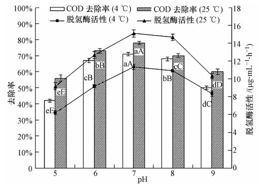 使用1 mol · L-1的H2SO4和1 mol · L-1的NaOH將模擬污水pH值分別調為5.0、6.0、7.0、8.0、9.0,投加耐冷菌后分別于4 ℃、25 ℃搖床培養96 h,計算其在低溫、常溫下COD的去除率及DHA活性.