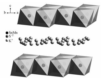 層狀金屬硫屬化物K2xMnxSn3-xS6(x=0.5~0.95)通過水熱法制備,在48 mL的反應釜中加入Sn(23 mmol)、Mn(11.53 mmol)、K2CO3(11.53 mmol)、S(69 mmol)和H2O(15.38 mL),在200 ℃下烘箱中水熱反應4 d,冷卻至室溫后,分別用水、CS2和乙醇依次洗滌數次,最后在60 ℃的真空干燥箱中干燥后待用(Manos and Kanatzidis, 2009).