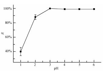 pH是影響離子交換的重要因素.為了研究pH的影響,將30 mg KMS材料分別加入到pH 1~6的Zn2+溶液中(100 mg · L-1,30 mL),在300 r · min-1的搖床中恒溫25 ℃連續振蕩12 h.圖 3是pH對Zn2+離子交換的影響,由圖可知,在pH 3~6之間,溶液的pH對離子交換的影響很小,其吸附量接近且去除率都可以超過99%.但在pH=1和2時,分別只有40%和88%的去除率,主要原因是溶液中過多的H+直接與K+發生離子交換,因而與Zn2+產生競爭吸附.另外特別是在pH=1時,H+會與KMS中的部分硫發生反應產生硫化氫氣體,也導致Zn2+的離子交換量減少.而在pH ≥ 2時,KMS能穩定存在,且H+的競爭作用也隨著pH的增大而減小.因而KMS更適用于pH ≥ 2的Zn2+溶液.本實驗選用pH=4的Zn2+溶液考察其他影響因素.