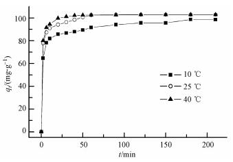 反應時間是影響吸附量的重要因素.將200 mg的KMS粉末放入到200 mL的鋅溶液中(pH=4.0;103 mg · L-1),分別在10 ℃、25 ℃和40 ℃的條件下,在300 r · min-1的搖床中連續振蕩12 h.圖 4是不同溫度下,反應時間對Zn2+吸附量的影響.在初始25 min內,不同溫度下的離子交換速率非常快;超過25 min,離子交換速率會降低且吸附量的變化較小.這主要是由于在初始階段,在KMS中的有充足的K+用于離子交換,但是隨著時間的增加,可離子交換的K+越來越少,因而交換速率就會降低.在10 ℃、25 ℃和40 ℃的條件下,其離子交換平衡達到的時間分別是80 min、120 min和120 min.在25 ℃和40 ℃條件下,其吸附量比較接近,但是在10 ℃條件下,其吸附量比其他溫度下要小一些.