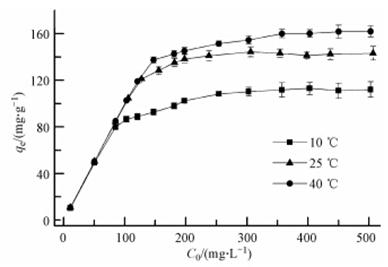 圖 5是在10 ℃、25 ℃和40 ℃條件下,KMS對Zn2+的等溫吸附線.由圖可知,在不同的溫度下,KMS對Zn2+的吸附量均隨著初始濃度的升高而逐步增加.這是由于KMS中有足夠的K+可以與Zn2+發生離子交換,但是隨著濃度的升高,可以離子交換的K+越來越到達極限,最后即使Zn2+的濃度再增加,也不會有更多的K+進行離子交換,所以吸附量越來越趨于平衡.在初始濃度小于100 mg · L-1時,不同溫度下,KMS對Zn2+的吸附量都是一樣的,但是在初始濃度大于100 mg · L-1時,吸附量會隨著溫度的升高而增加.在10 ℃、25 ℃和40 ℃下,KMS對Zn2+的最大吸附量分別是:111.67 mg · g-1、142.91 mg · g-1和161.02 mg · g-1.