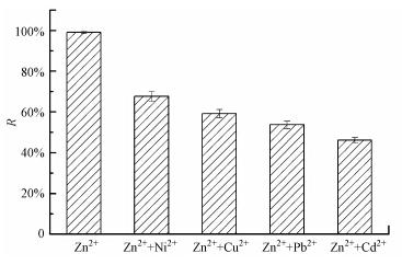 KMS材料可以有效地去除Cd2+、Pb2+和Ni2+等重金屬離子,而在實際水體中,往往多種重金屬離子是共同存在的.本實驗將Cd2+、Pb2+、Ni2+和Cu2+等重金屬離子與Zn2+進行競爭吸附.圖 7為在Zn2+溶液中,分別加入相同摩爾濃度的上述4種金屬離子后,KMS對Zn2+的去除率.由圖可知,投加重金屬離子后,Zn2+的去除率有較大的降低,說明這些重金屬與Zn2+的競爭吸附作用比較明顯.但是各個重金屬離子對Zn2+的影響程度是不一樣的,影響順序是:Cd2+ > Pb2+ > Cu2+ > Ni2+.主要是由于根據軟硬酸堿原理,硫原子是軟堿,Cd2+是軟酸,而Pb2+、Ni2+、Cu2+和Zn2+都是交界酸(許家勝等,2010),所以在K+被交換后,層上的硫更易于與Cd2+產生共價鍵作用.因而導致Zn2+和Cd2+共存時,會使Zn2+的去除率變得最低.而對于同價態的Pb2+、Ni2+、Cu2+,原子半徑越大,原子核對外層電子的吸引就越弱,更易與負電性的硫發生共價鍵作用.而離子半徑:Pb2+ > Cu2+ > Ni2+,則與Zn2+的競爭吸附后,對Zn2+的去除率的影響順序是Pb2+ > Cu2+ > Ni2+.