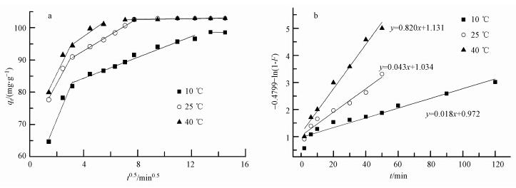 式中,F為t時刻吸附質分數,是t的函數;qt和qe分別是t時刻(min)吸附量和極限吸附量(以平衡吸附量代替).以[-0.4977-ln(1-F)]對t作圖(圖 8b),呈較好的直線關系,但是都不通過原點,說明在不同溫度條件下,液膜擴散是吸附的主要速率控制步驟(岳欽艷等,2007).