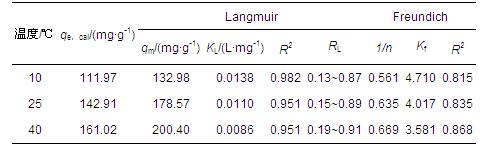 顆粒物內擴散速率常數kw和和截距Ci可以通過屬于顆粒物內擴散作用的第二條直線的數據計算得到擬合參數,其中Ci在10 ℃、25 ℃和40 ℃反應溫度下分別為77.89 mg · g-1、82.84 mg · g-1和85.55 mg · g-1.Ci被認為是用來表征膜擴散程度的,Ci越大,擴散邊界層越厚,液膜擴散的影響就越顯著.隨著溫度的升高,Ci會變大,這說明液膜擴散隨著溫度的增加也越來越顯著(Lin et al., 2011).