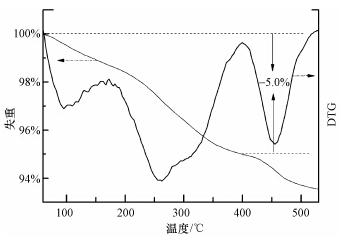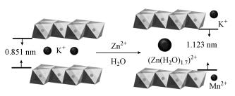 Zn2+與K+離子交換后的XRD圖,如圖 2中的B曲線所示,材料的特征衍射峰移到2θ=7.87°.利用布拉格公式計算,材料的層間距由0.851 nm變為1.123 nm.通過EDS的測試分析發現Zn2+會與硫屬陰離子無機層中的部分Mn2+發生離子交換.離子交換后的材料經過濾洗滌,再在60 ℃真空干燥箱中干燥,最后通過熱重分析,如圖 9所示.在溫度小于400 ℃時,材料失去總質量的5%,屬于水分的失重.通過計算可以得出與K+交換后的每個Zn2+帶有約1.7個水分子.水合鋅離子會比鉀離子的半徑要大,故而離子交換后,層間距變大.這與KMS與Sr2+離子交換的情況相似,離子交換后進入層間的Sr2+也會以水合鍶離子的形式存在而導致層間距增大(Manos et al., 2008).反應方程式和離子交換示意圖分別見方程(12)和圖 10.