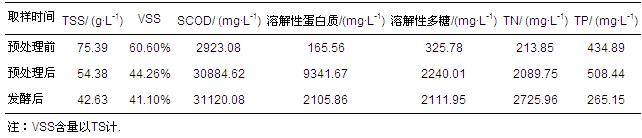 取排出后的污泥進行各項指標分析.pH、TS、VS、TN、TP和NH+4-N等常見指標采用標準方法測得(魏復盛,2002).發酵后污泥以10000 r · min-1的速度離心10 min,然后將上清液通過0.45 μm的針頭式過濾器過濾,過濾后的液體存放于4 ℃冰箱,用于測量SCOD、溶解性蛋白質、溶解性多糖、TN、TP、NH+4-N和VFA.