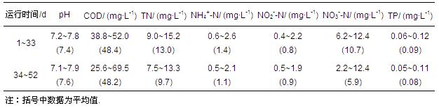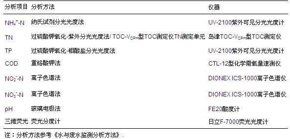 試驗中測定的水質(zhì)指標(biāo)、所用儀器和分析方法如表 3所示.水樣經(jīng)0.45 μm濾膜過濾,測定TN、NO2--N、NO3--N和三維熒光.試驗中,每2 d取樣1次并測定,測定指標(biāo)為進(jìn)出水的pH、溫度、COD、NH4+-N、NO2--N和NO3--N和TN濃度.分析測試所用藥劑均為化學(xué)分析純試劑.
