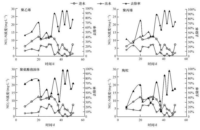 圖 2 聚乙烯、聚丙烯、聚氨酯泡沫體和陶粒MBBR對NO3--N的去除效果