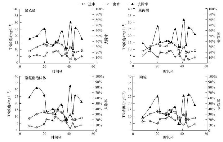 圖 4 聚乙烯、聚丙烯、聚氨酯泡沫體和陶粒下MBBR的TN去除效果